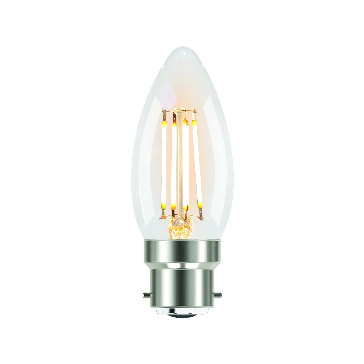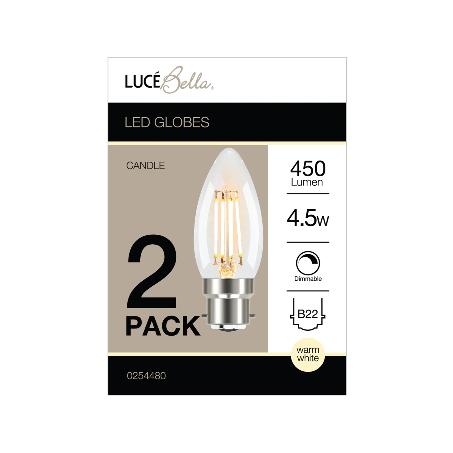 Light up your home with the Luce Bella Candle Filament B22 LED 450 Lumen Warm White Dimmable 4.5W Globe. This decorative globe will bring warmth to any room of the home. This bulb has a colour temperature of 3000K, providing you with a warm, tranquil atmosphere.2 Pack