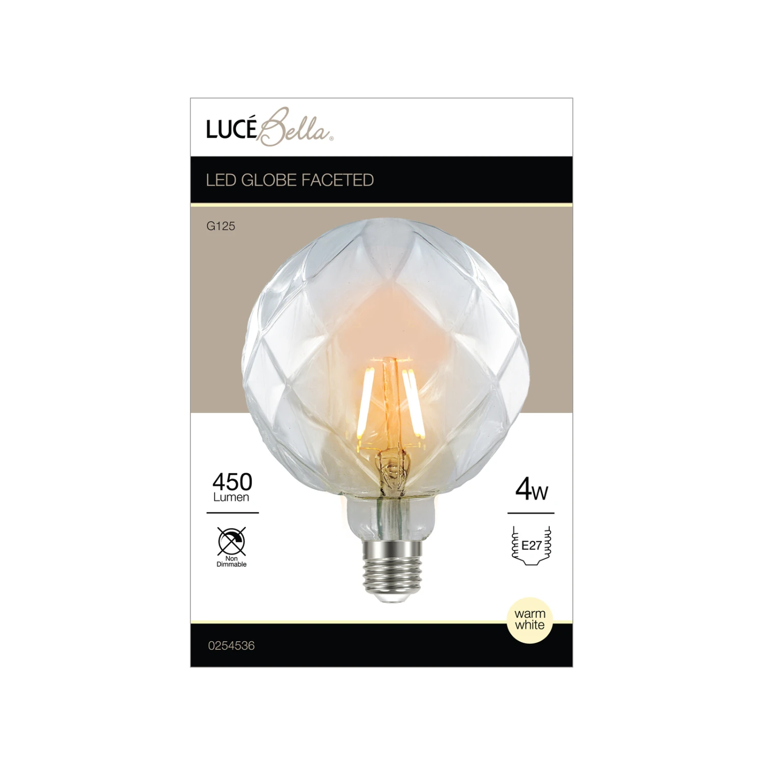 Light up your home with the Luce Bella G125 Faceted E27 LED 450 Lumen Warm White 4W Globe. This decorative globe will bring warmth to any room of the home, with the Warm White light and the patterned glass.Can be used in a table lamp that emphasizes the decorative globe.