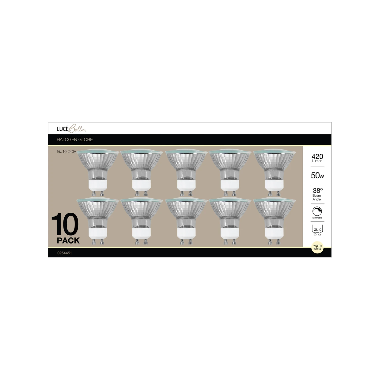 Light up any room with the Luce Bella Halogen GU10 38° Dimmable 50W Globe. This globe has a 38 Degrees bean angle and has an instant light when it’s switched on. This globe is dimmable and the warm white colour will provide you with a warm, tranquil atmosphere.Great value in a 10 pack