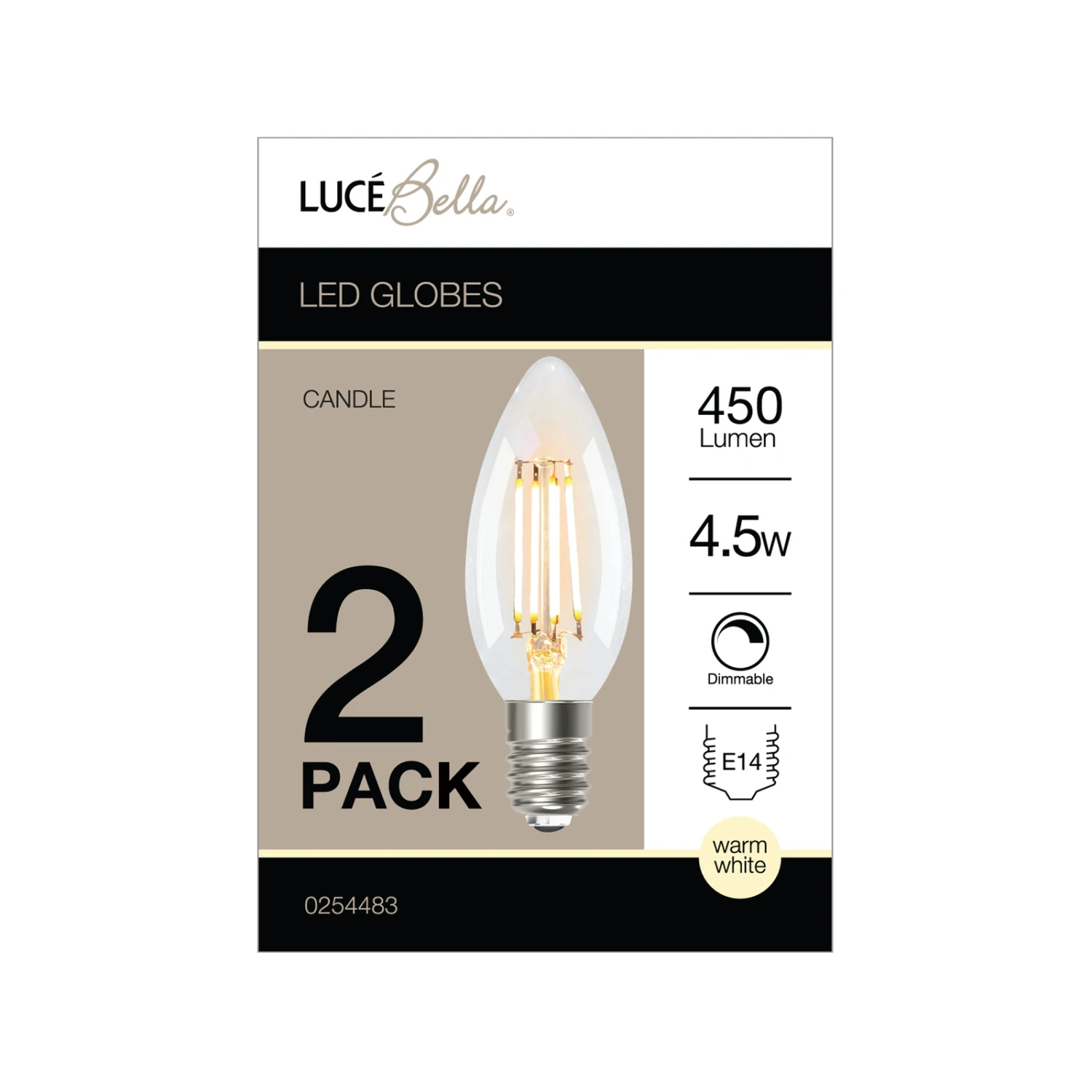 Light up your home with the Luce Bella Candle Filament E14 LED 450 Lumen, Dimmable, Warm White 4.5W Globe. This decorative globe will bring warmth to any room of the home.This bulb has a colour temperature of 3000K, providing you with a warm, tranquil atmosphere.2 Pack