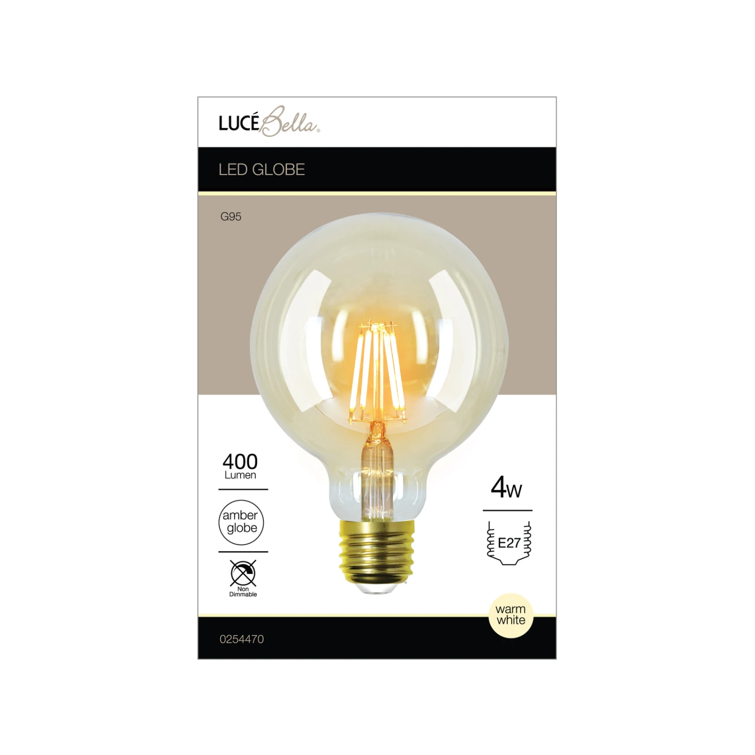 Light up your home with the Luce Bella G95 E27 LED Amber 400 Lumen Warm White 4W Globe. This decorative globe brings warmth to any room of the home.This bulb has a colour temperature of 2700K, providing you with a warm, tranquil atmosphere, and the Amber coloured glass provides a very cozy light